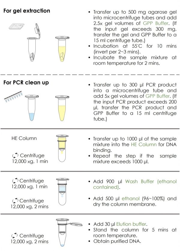 The FavorPrep™ Gel/PCR Purification HE (High Efficiency) Mini Kit is designed to efficiently isolate DNA from agarose gel slices, PCR products, and enzymatic reaction mixtures. The distinct buffer system and column support the processing of larger-scale agarose gels and PCR products by providing high DNA binding capacity. The purified DNA, recovered across a broad range of fragment sizes, exhibits high yield and optimal purity. The resulting DNA quality ensures reliable performance in PCR, restriction enzyme digestion, cloning, DNA labeling, and next-generation sequencing (NGS).