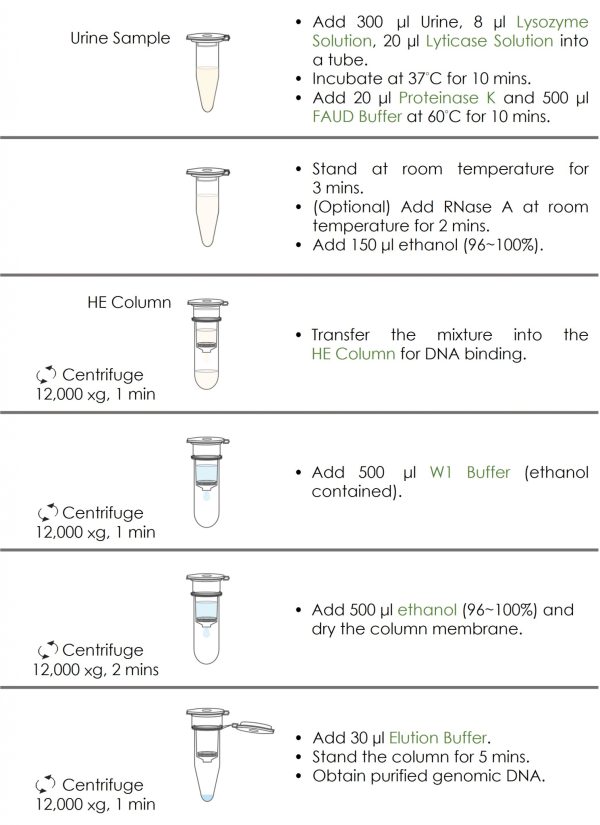 The FavorPrep™ Urine DNA Extraction HE (High Efficiency) Mini Kit is an efficient tool for rapidly isolating genomic DNA from urine sample. Due to the less-abundance microorganisms and presence of PCR inhibitors in urine, DNA extraction from urinary samples remain challenging. The enzymes provided in the kit allow to digest microbial cell structures effectively and the special buffer removes PCR inhibitors to obtain pure, high-quality DNA. The distinctive FAUD HE Column allows to enlarge sample scale and reduce elution volume to obtain the concentrated microscale DNA. This kit ensures reliable and reproducible urological microbiota data to explore the urobiome.